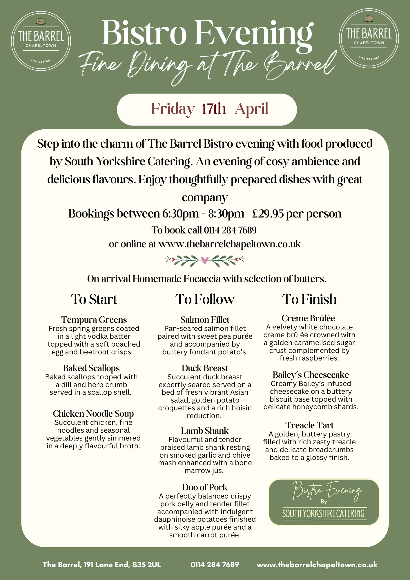 Friday 17th April, Bookings from 6.30pm onwards.